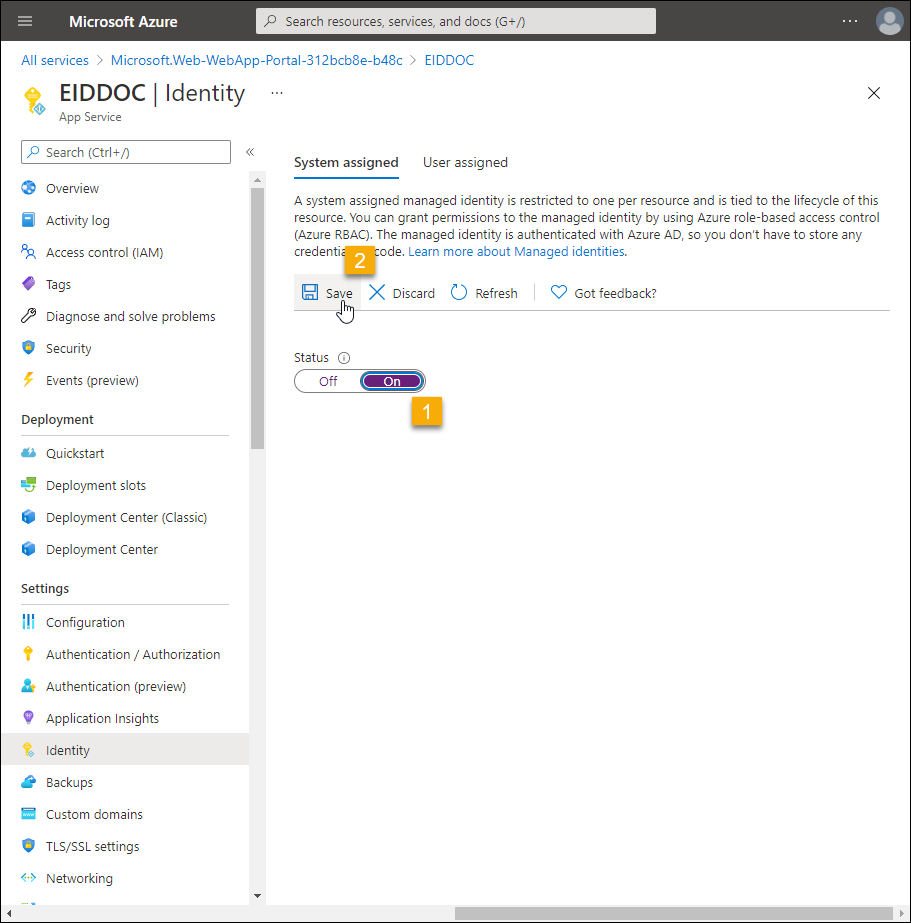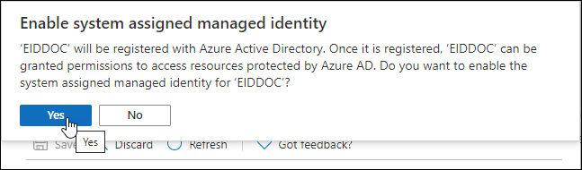 - Click Yes to confirm you want to enable system assigned managed identity and register the App Service with Azure Active Directory.