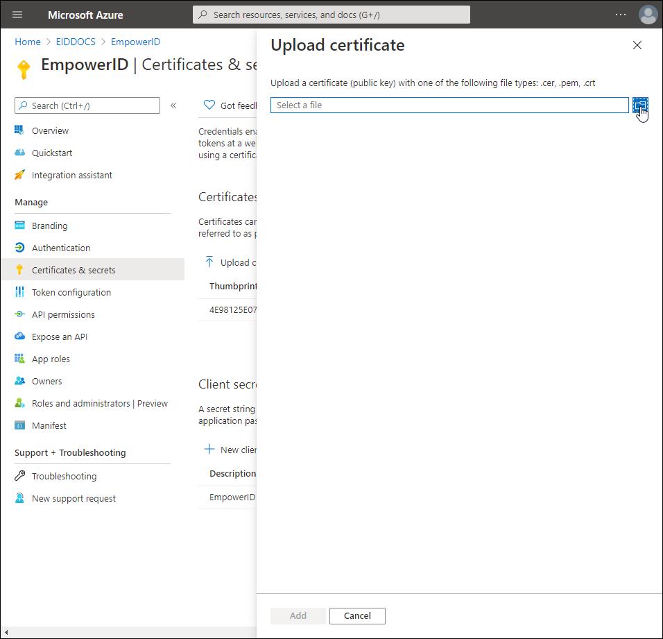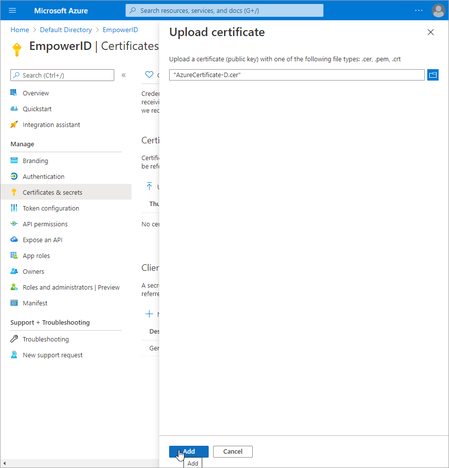- Select the base-64 encoded certificate you downloaded from EmpowerID and click Add.