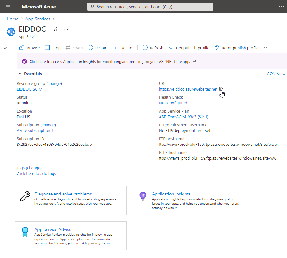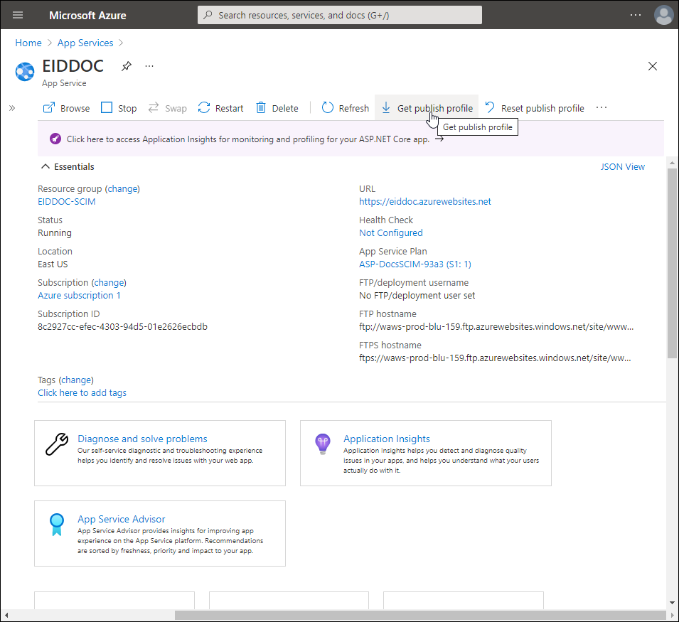 - Back in the Overview page for the App Service, click Get Publish Profile. You will need this file when you publish the Workday microservice to Azure.