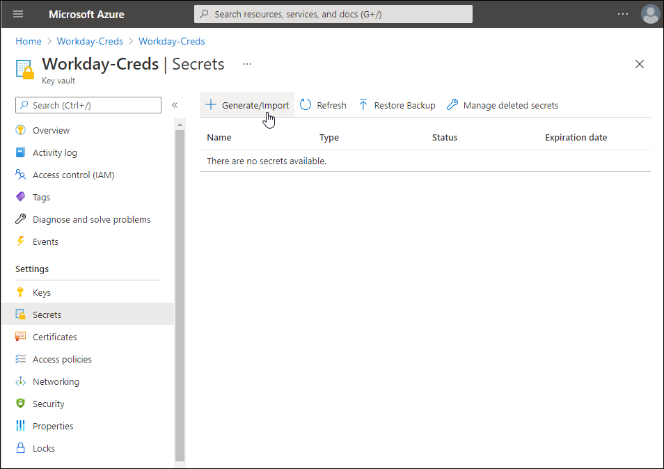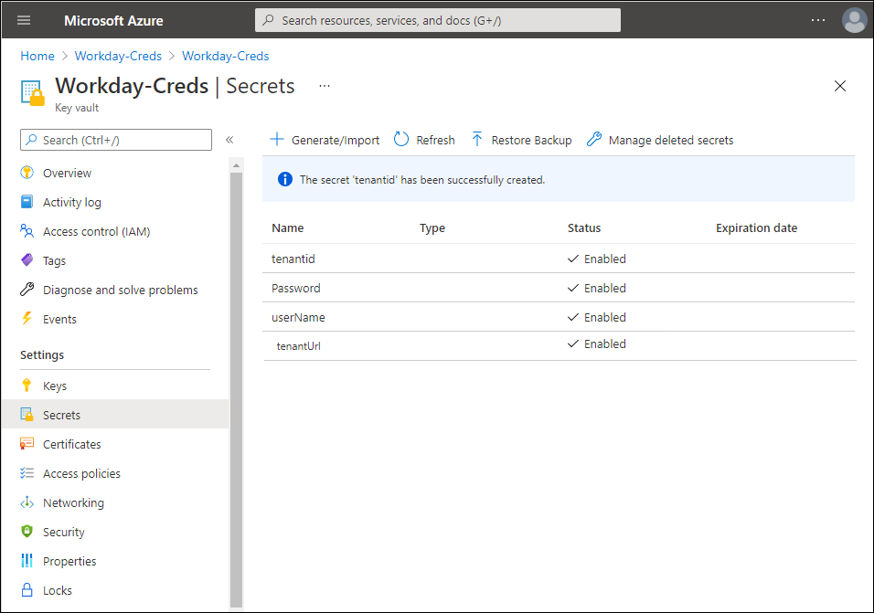 Step 7 – Create a key vault with secrets to store Workday credentials