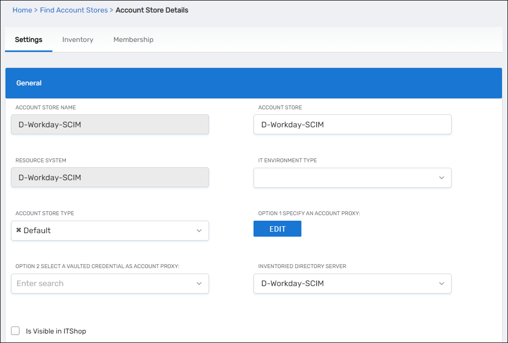 This opens the edit page for the account store. This page allows you to specify the account proxy used to connect EmpowerID to your Workday instance and how you want EmpowerID to handle the user information it discovers in Workday during inventory. Settings that are relevant to Workday are described in the table below the image