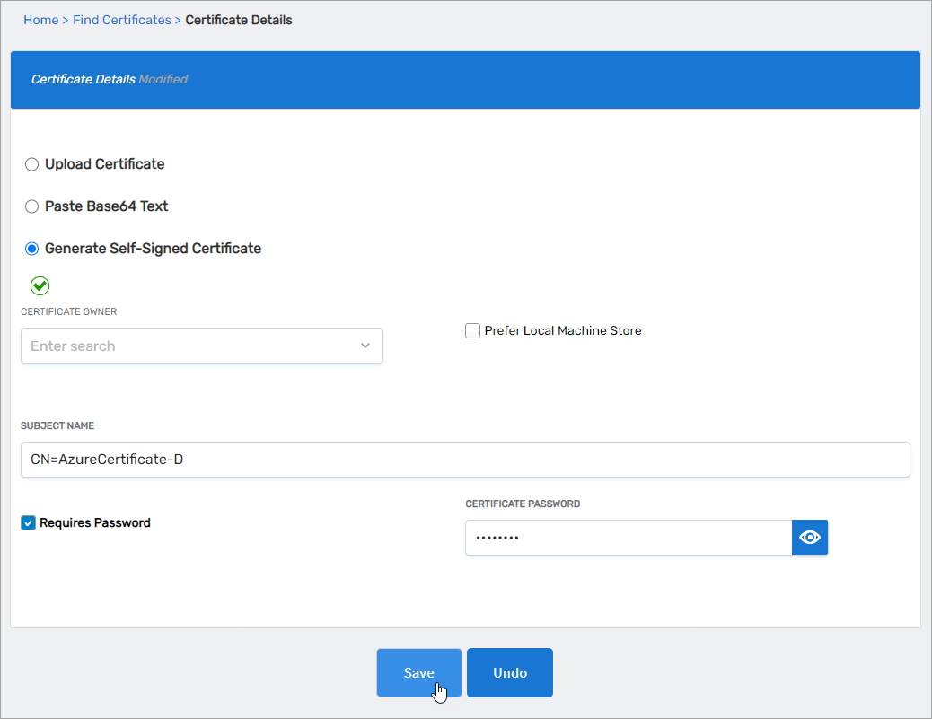 The public key certificate that you upload to Azure must have a corresponding private key in the EmpowerID certificate store; otherwise, an error will occur when calling Azure’s API.