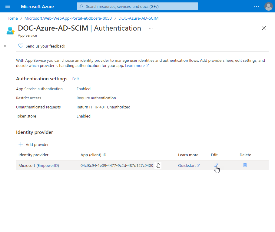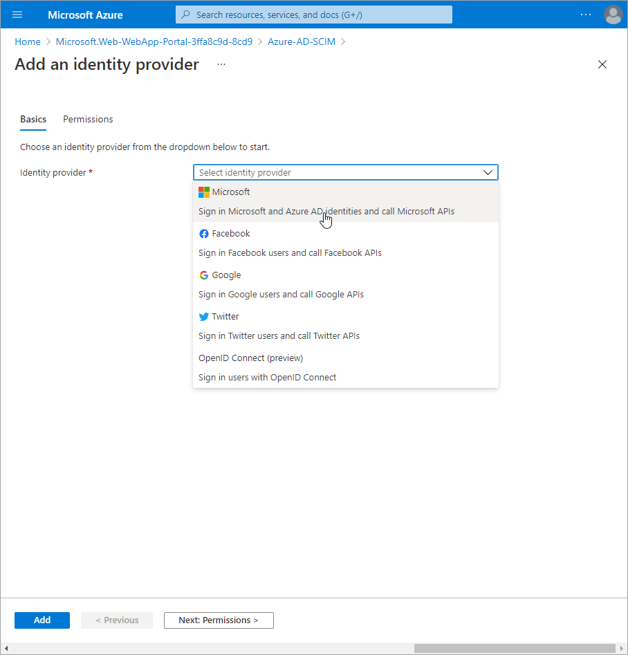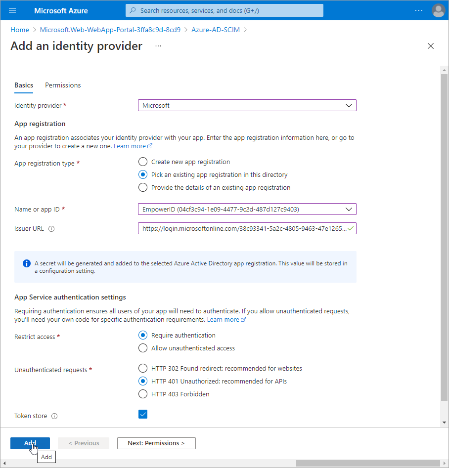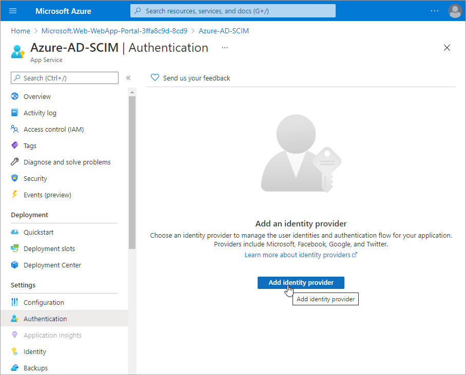 - Navigate to the Authentication blade for the app service and click Add identity provider.