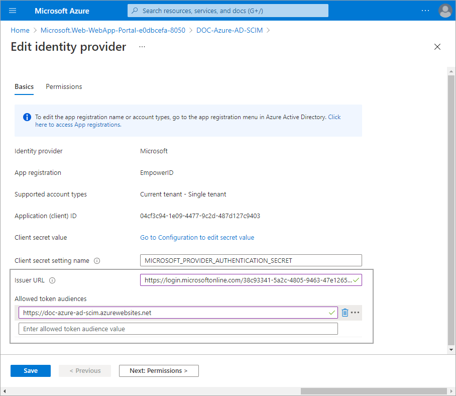 - Once the application is registered, copy the Application (client) ID and Directory (tenant) ID from the Overview page. These values are used when configuring the SCIM app service.