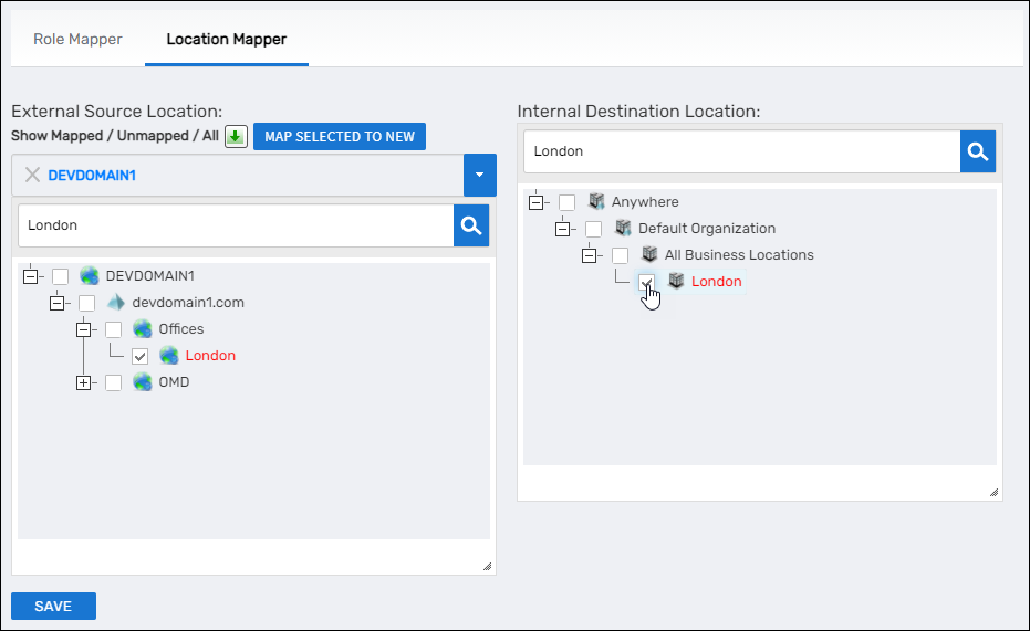 If you select an external role or an external location that is a parent role or location, the children of that role or location will be mapped to the selected EmpowerID location.