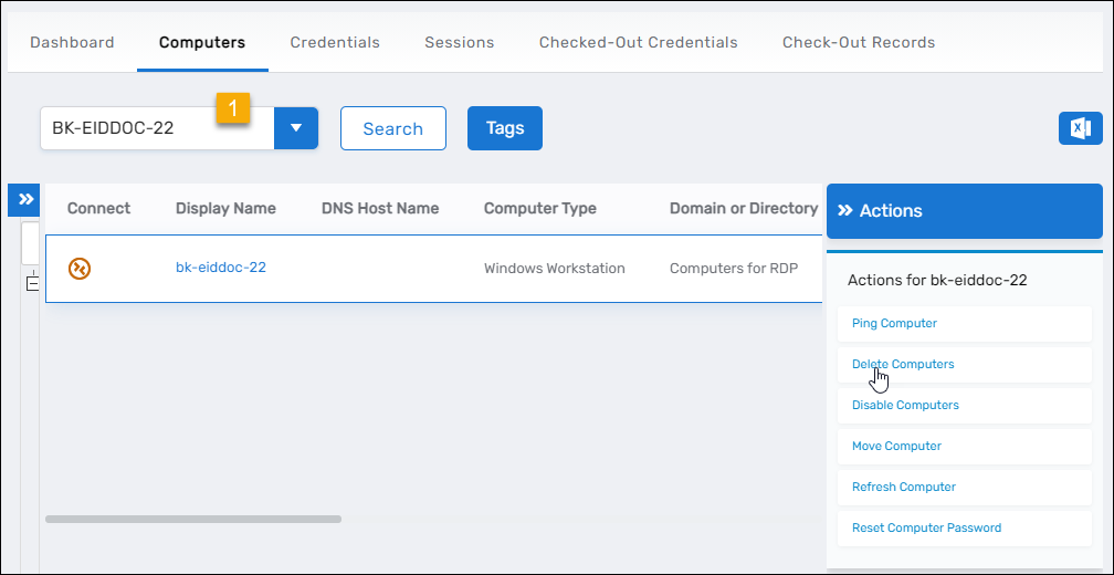 - Search for the computer you want to delete, click the record for that computer to select it and then click the Delete Computers action link.