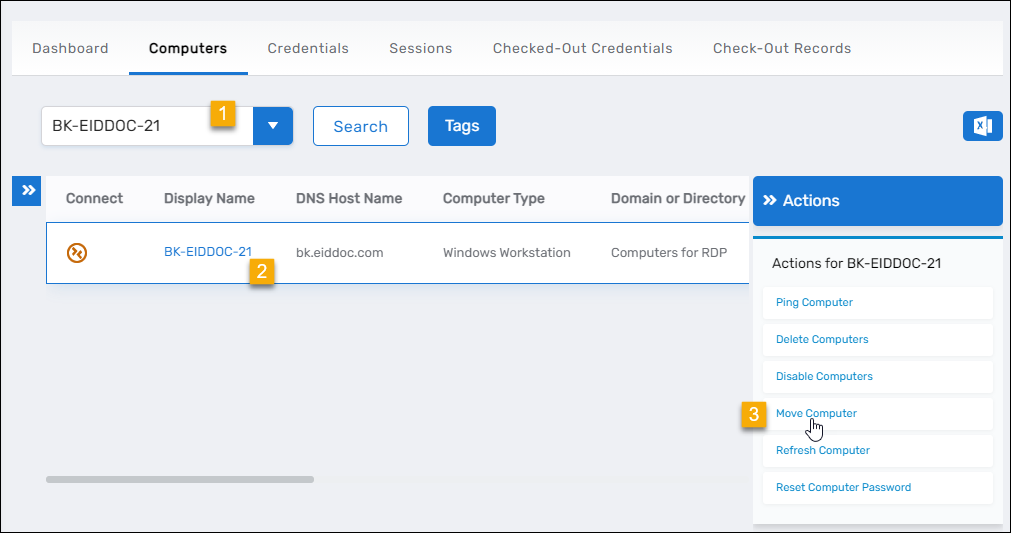 - Search for the computer you want to move, click the record for that computer to select it and then click the Move Computers action link.