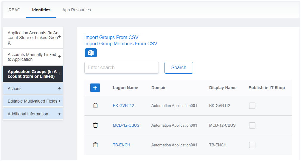 - On the View One page for the application, select the Identities tab and then expand the Application Groups (In Account Store or Linked Group) accordion.