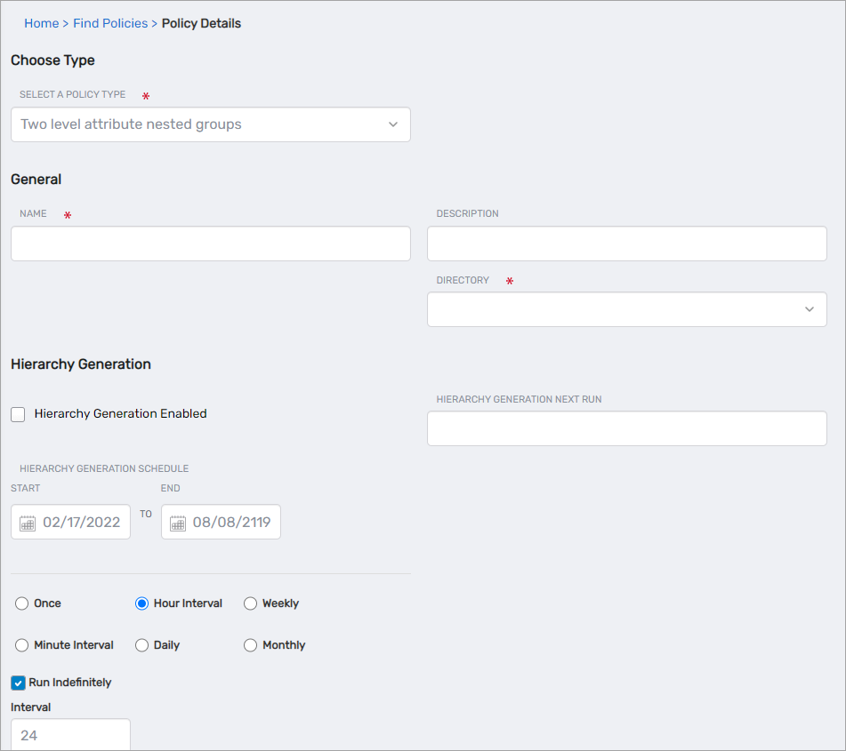 Hierarchy Generation Interval – Set the interval for the Hierarchy Generation job to process the policy. Options include: