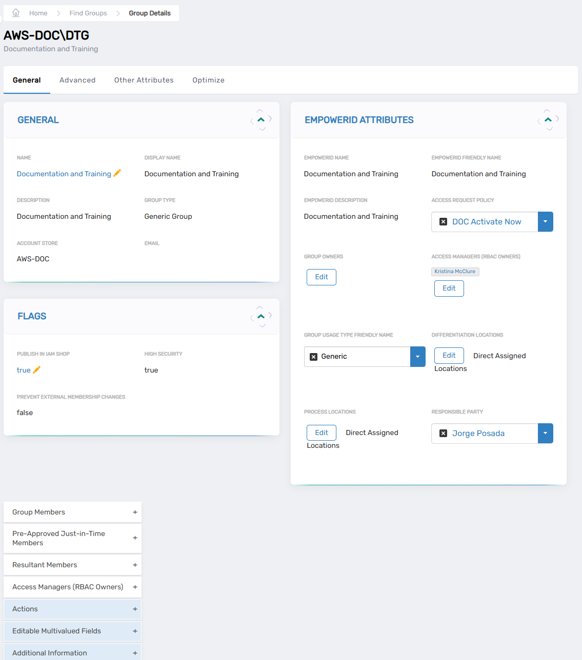 The General tab allows users to view general information about a group and manage aspects of that group as needed. The tab contains a number of components to include informational cards about the group, as well as various accordions that provide authorized users access to workflows for managing the group.