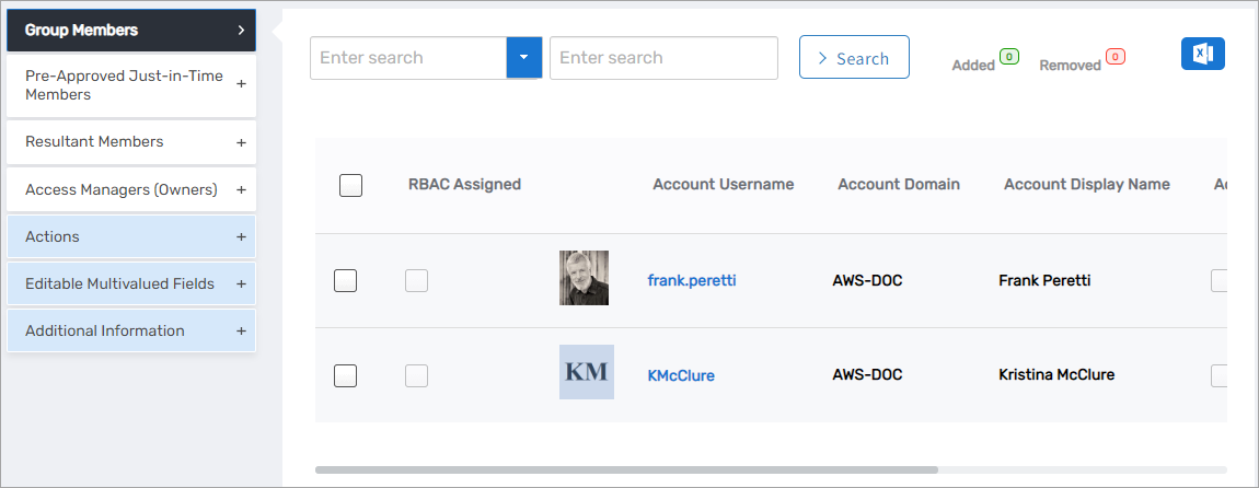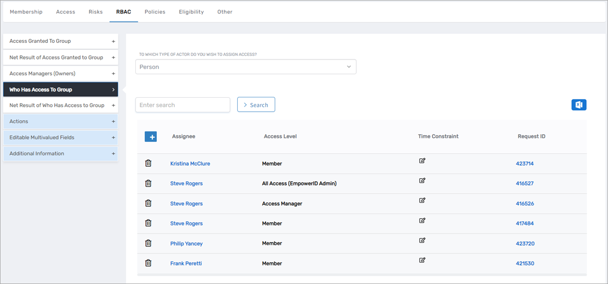 RBAC Tab | Displays categorized RBAC information about the group, such as group membership![]() |