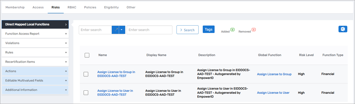 Functional Access Card | Displays any local functions the group has, and the risk level associated with those functions![]() |