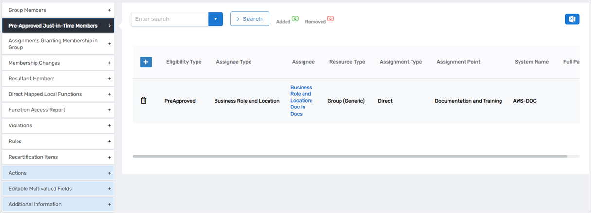 Pre-Approved Just-in-Time Members Accordion | Displays assignees who are pre-approved for group membership. Pre-approved assignees are automatically granted membership when requesting it from the IAM Shop. In the below image, the pre-approved assignee is a Business Role and Location. This means that all members of the Business Role and Location are pre-approved.![]() |