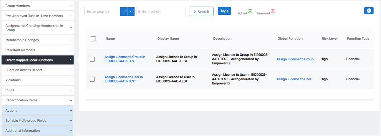 Direct Mapped Local Functions Accordion | Displays all local functions mapped directly to the group and gives authorized users the ability to manage the functions mapped to a group![]() |