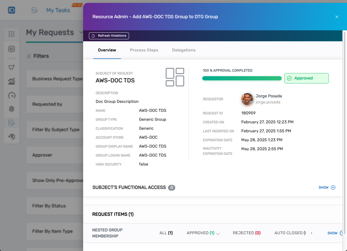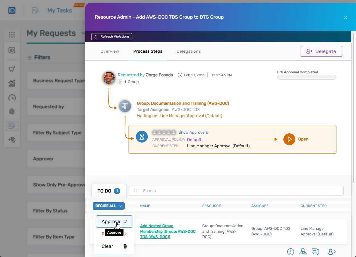 - If you are an approver, click the Decision button for the request and select Approve.