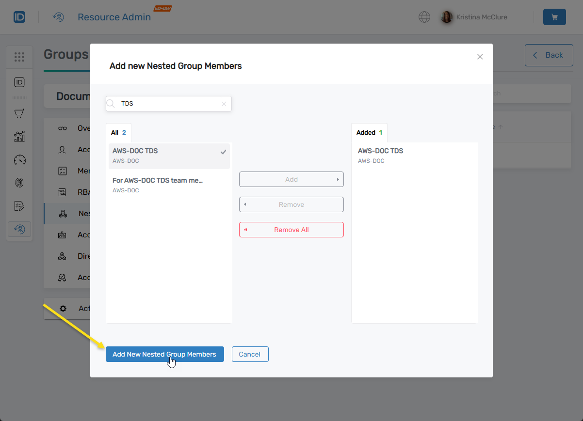 - In the Add New Nested Group Members modal, search for the group you want to nest.