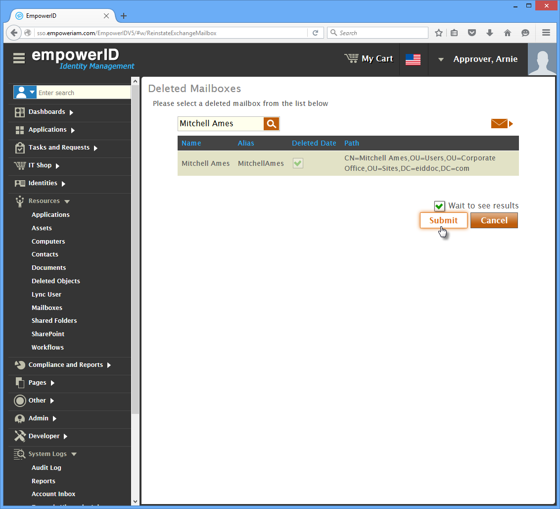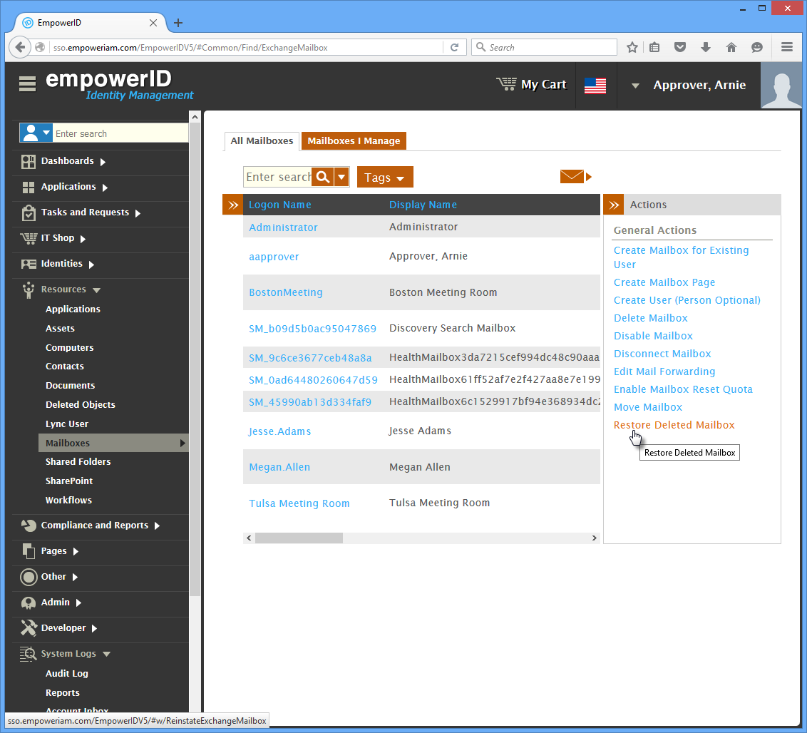 This topic demonstrates how to restore a mailbox that was previously deleted in EmpowerID.