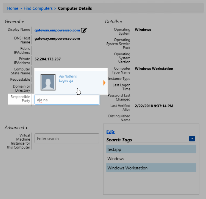 - On the Computer Details page that appears, click in the Responsible Party field and start typing a name to search, and then click the tile for that person to select it.