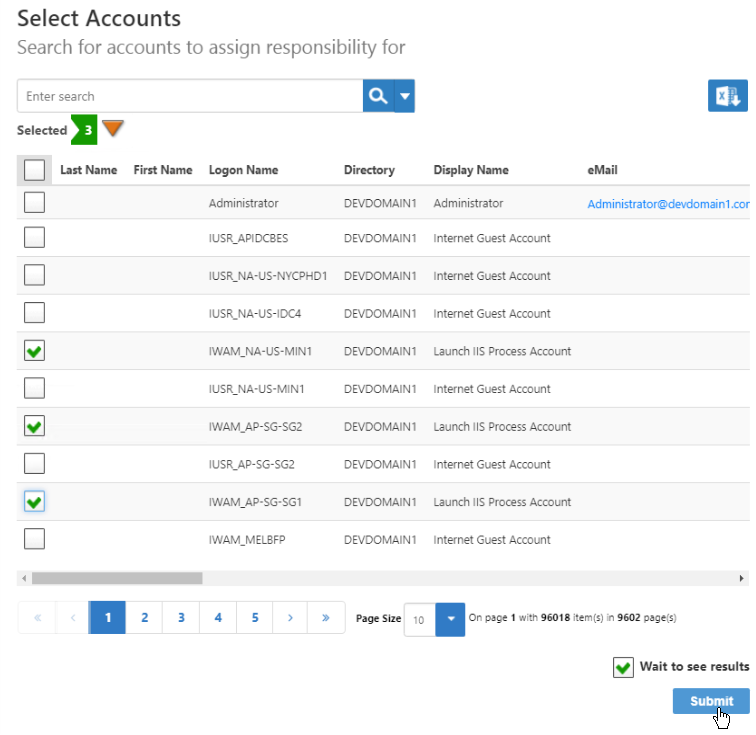 - In the Select Person page that appears, select the person you want to assign as the responsible party for the selected accounts and click Submit.