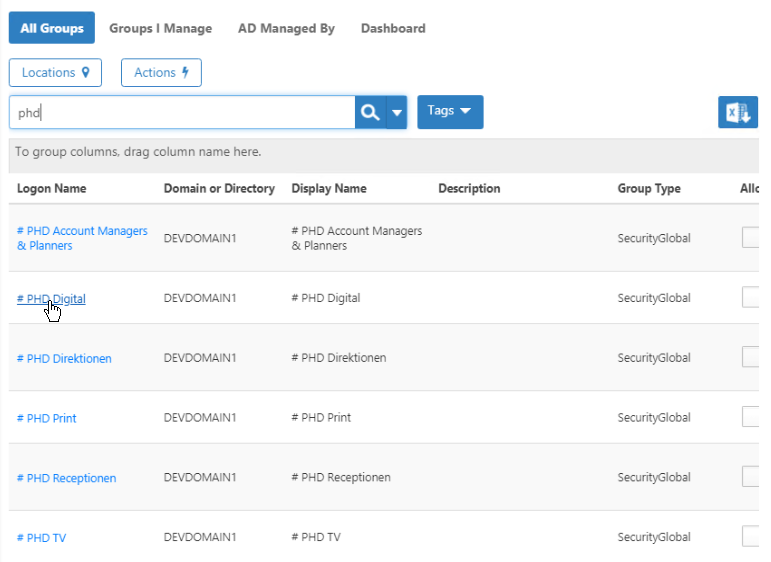 In the list of Groups that appears, click the Logon Name for the Group that you want to assign.
