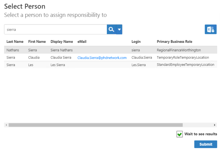 - In the Select Person page that appears, select the person you want to assign as the responsible party of the selected Groups and click Submit.