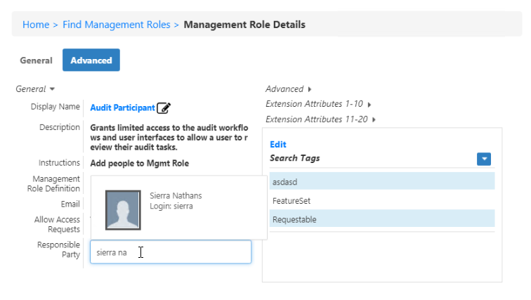 - On the Management Role Details page that appears, on the Advanced tab, click in the Responsible Party field and start typing a name to search, and then click the tile for that person to select it.
