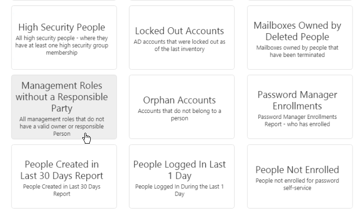 To avoid having management roles with no responsible party, run the Management Roles without a Responsible Party report. You can assign responsibility using the Responsible Party property on the Management Role Details page for each management role, or bulk assign them from the Management Roles ViewMany page.