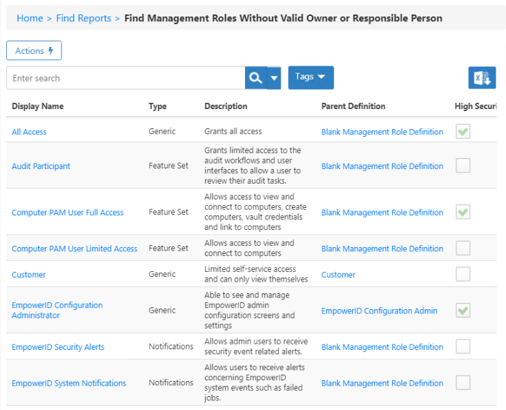 - A grid populates with information about all Management Roles in the EmpowerID system that do not have a responsible party.