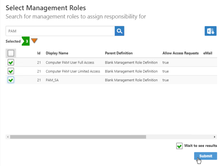 - On the Select Management Roles page that appears, select Management Roles to assign to a responsible party and click Submit.