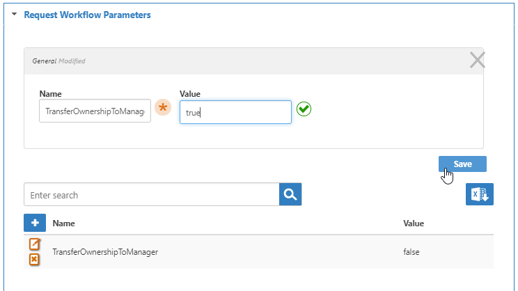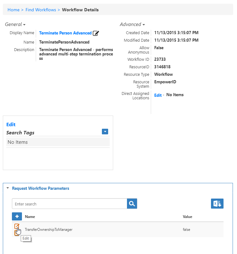 3. On the Workflow Details page, expand the Request Workflow Parameters accordion, and click the Edit button next to the TransferOwnershipToManager parameter.