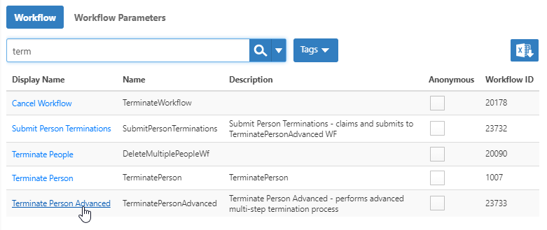 - On the Workflows page, search for the Terminate Person Advanced workflow and click the link to open the Details page for the workflow.