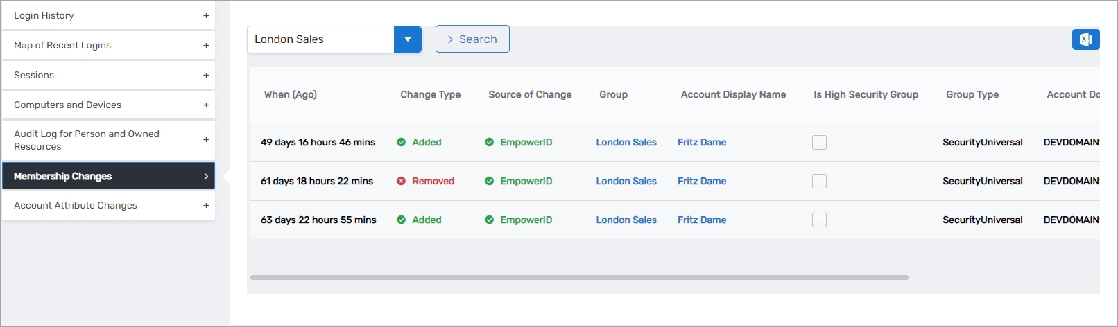 Membership Changes | Displays group membership changes associated with the person.![]() |