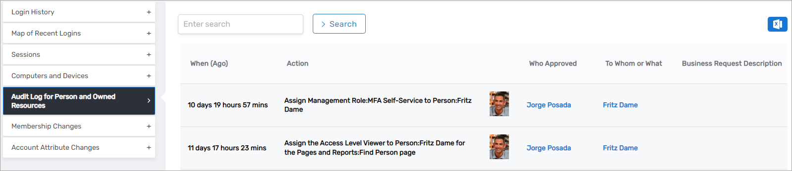 Audit Log for Person and Owned Resources Accordion | Displays the last 46 records of actions performed against the person.![]() |