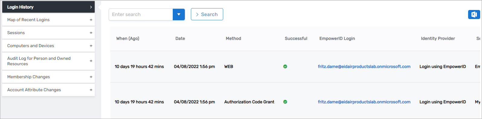 Login History Accordion | Displays information about the last 30 logins of the person.![]() |