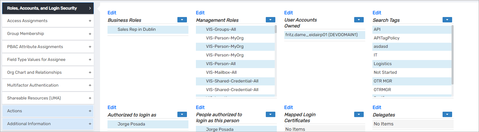 Roles, Accounts, and Login Security Accordion | Displays the Business Roles, Management Roles, and users accounts associated with the person, as well as provides access to edit these as needed.![]() |
