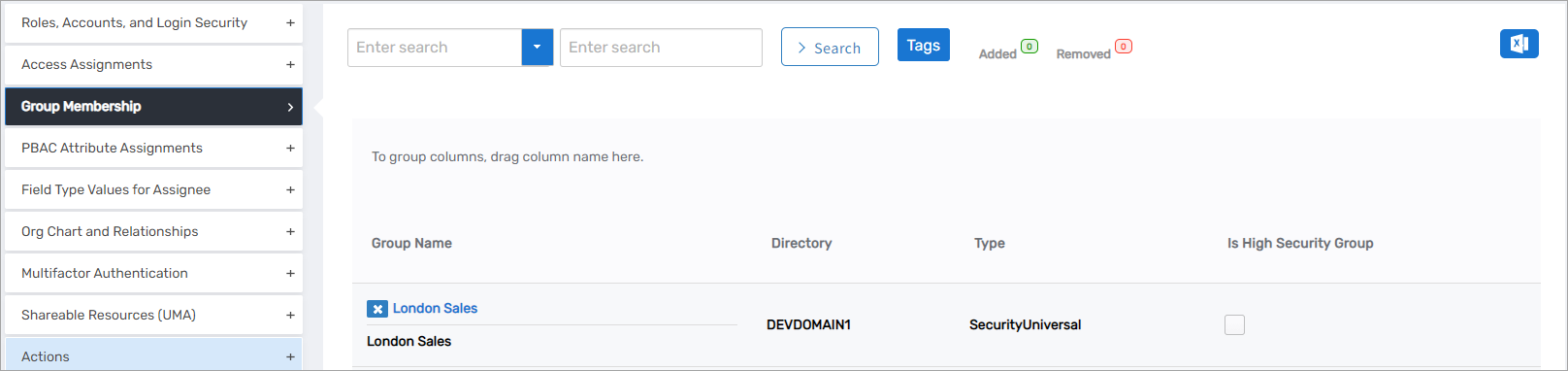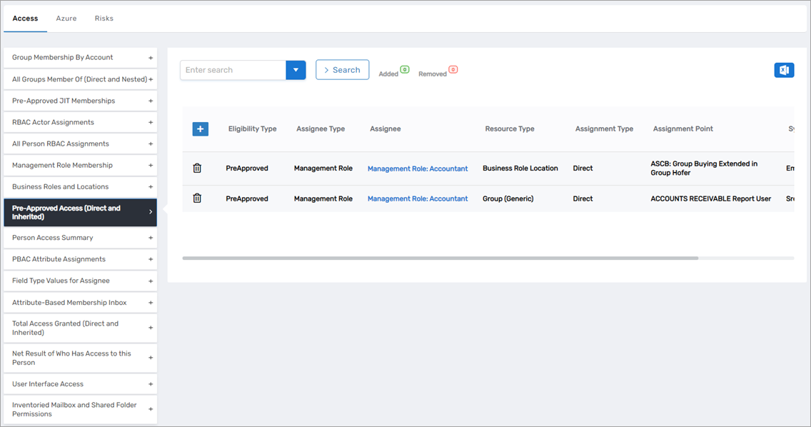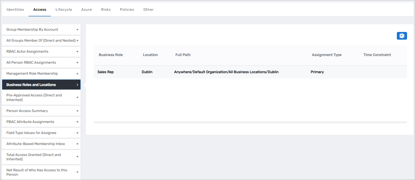 Access Tab | Displays access the person currently has in the system via direct and indirect assignments (such as belonging to a role that grants access to a group, etc.)![]() |