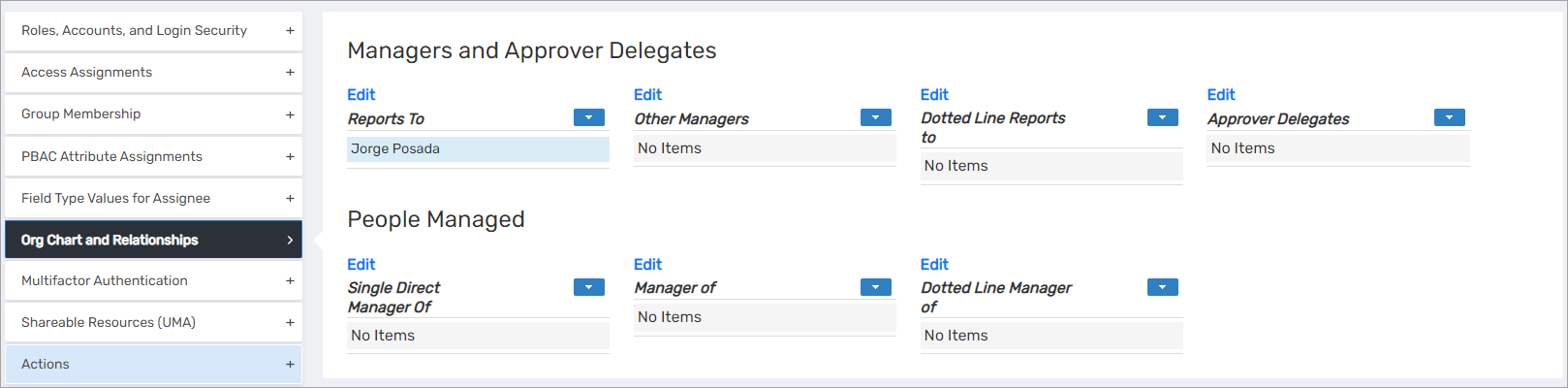 Org Chart and Relationships Accordion | Displays current org chart information for the person, such as their manager, and provides access to edit and update those relationships![]() |