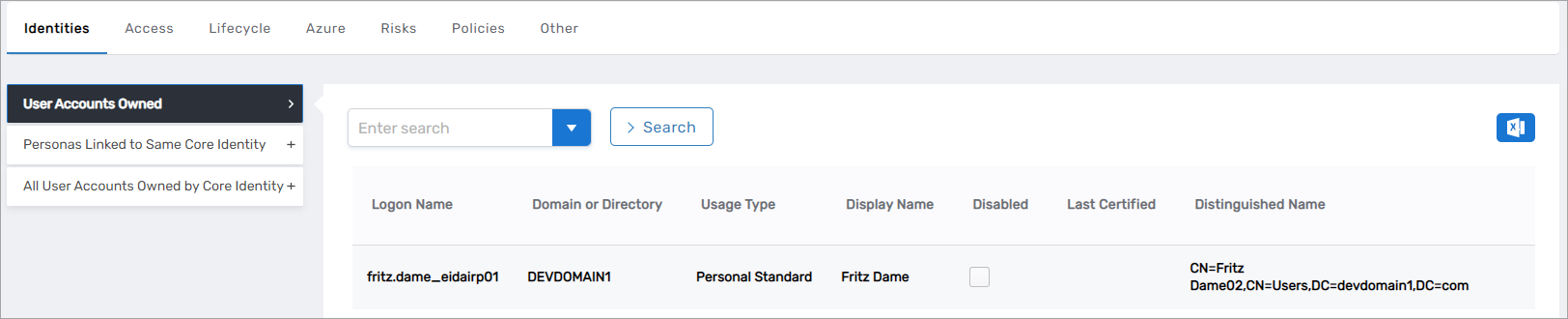 Identities Tab | Displays the user accounts owned by the person, the personas linked to the same Core Identity, and all user accounts owned by the person’s Core Identity.![]() |