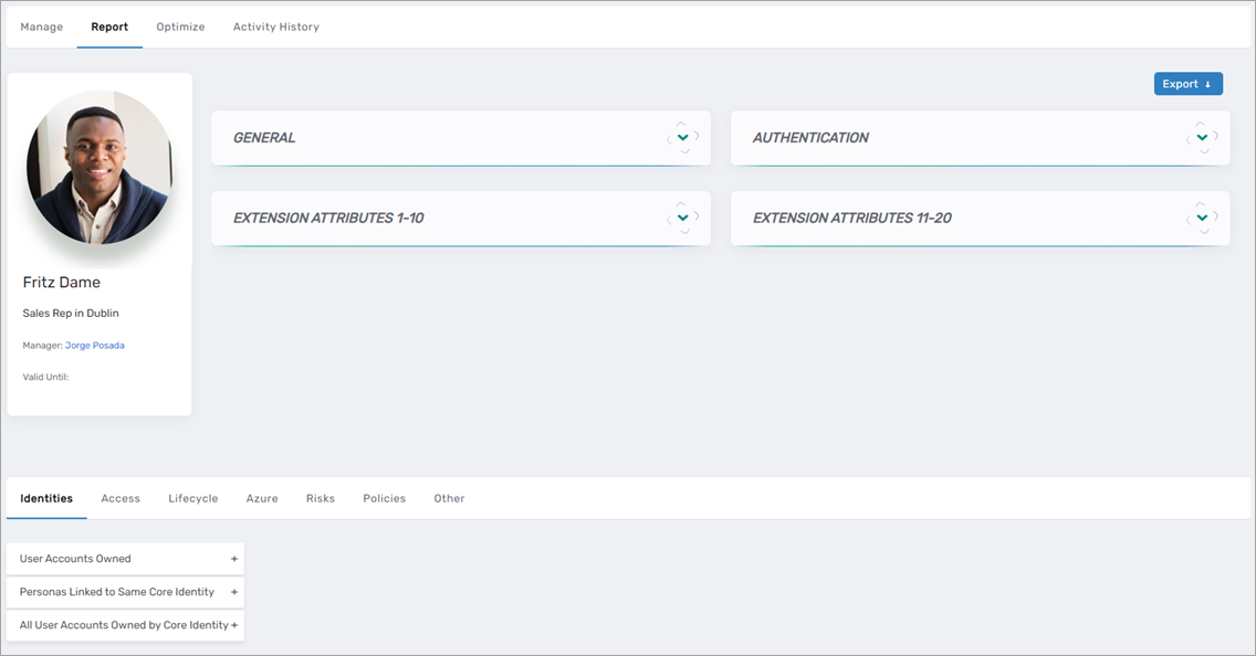 The Report tab provides an overview of information related to the person, such as all user accounts owned by the person’s Core Identity, the amount of access the person has in the system, policies linked to the person, and more. The tab contains a number of components to include informational cards about the person, as well as various subtabs and accordions that allow users to drill deeper into an aspect of information related to the user and manage that information as needed.