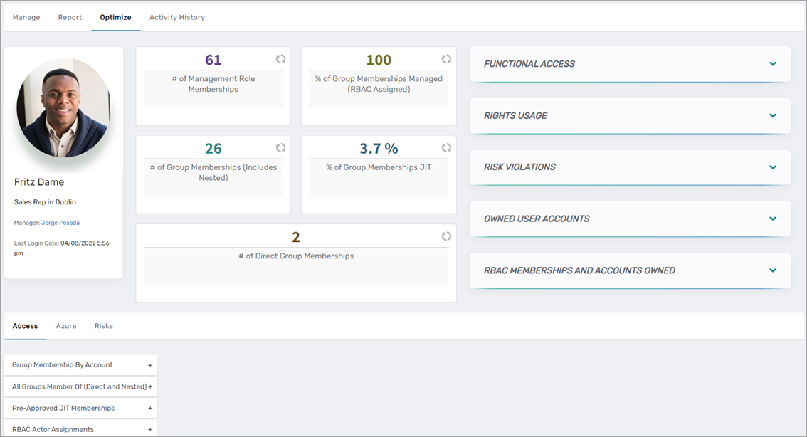 The Optimize tab provides quick access to visual dashboards of information related to role and group memberships for the person, as well as allows users to view basic information about a person and manage that person as needed. The tab contains a number of components to include informational cards about the person, as well as various accordions that provide authorized users access to workflows for managing the person.