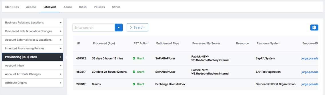 Lifecycle Tab | Displays categorized lifecycle information about the person, such as the resources that have been provisioned or revoked by policy![]() |