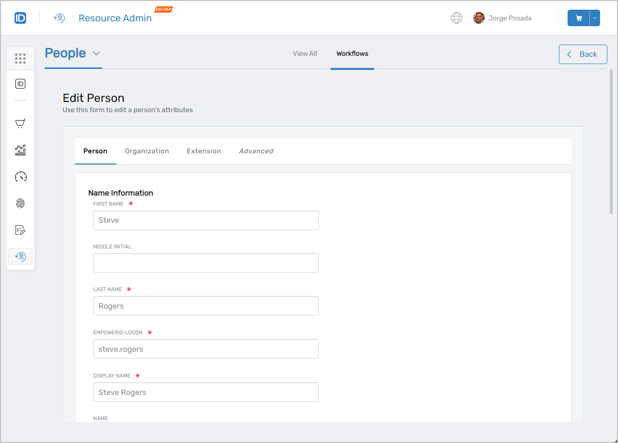 Delegated users can edit the attributes of any person in the Resource Admin application. If the person being edited has user accounts in any connected account stores where attribute sync is enabled, EmpowerID pushes those edits to each external directory account owned by that person.