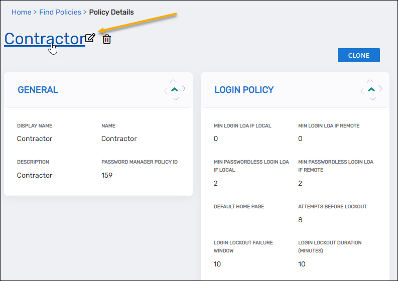 - Search for the Password Manager policy for which you want to set the home page and click the Display Name link for the policy.