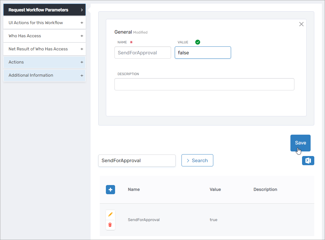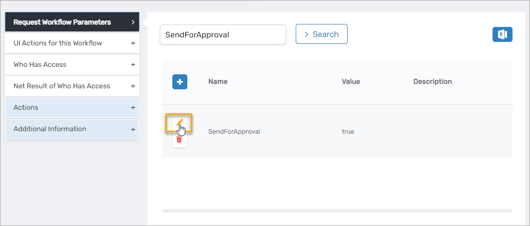 - On the View One page for the workflow, expand the Request Workflow Parameters accordion and search for the SendForApproval parameter.