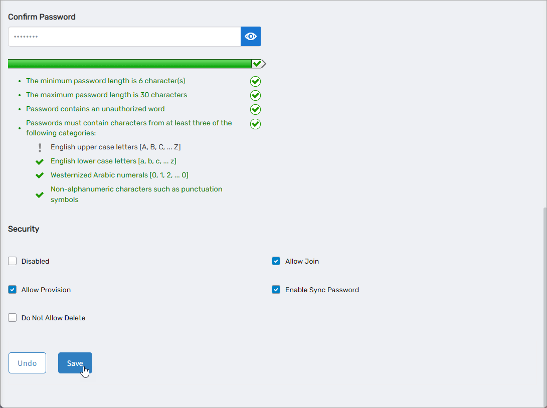 - Confirm Password – Visibility of this field depends on whether you have selected Allow me to enter a password. If visible, enter the password for the user