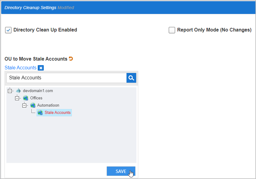 Directory Clean Up Enabled — Select this option to enable automated directory cleanup for the account store. The below two settings only appear when in the section when the this setting is enabled. Additionally, if the account store is not an Active Directory or LDAP account store, the OU to Move Stale Accounts setting will not appear as the setting is not relevant for those account store types.