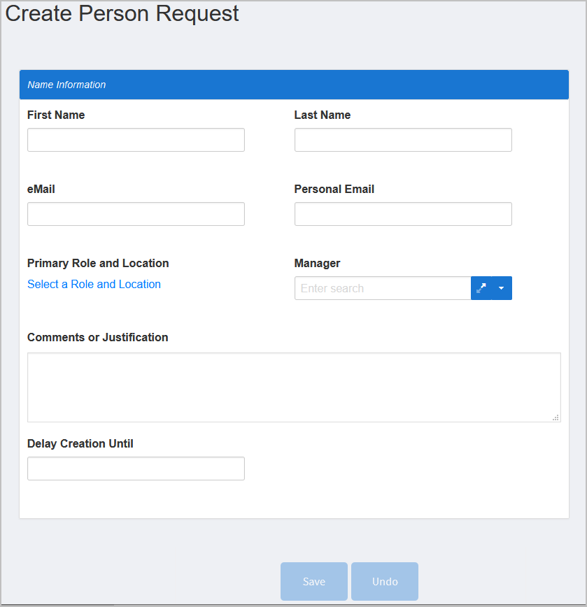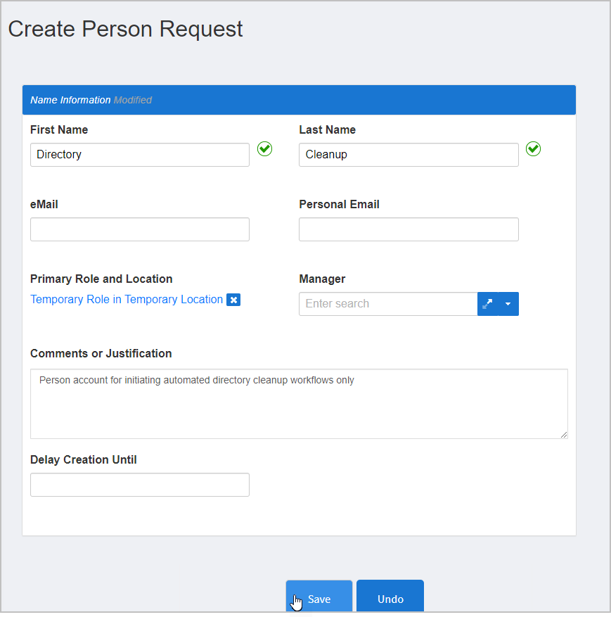 First Name and Last Name — Enter the first and last name of the Person you are creating. It is recommended that you choose a name that identifies the purpose for this person, such as "Terminate AccInitiator" or something similar.