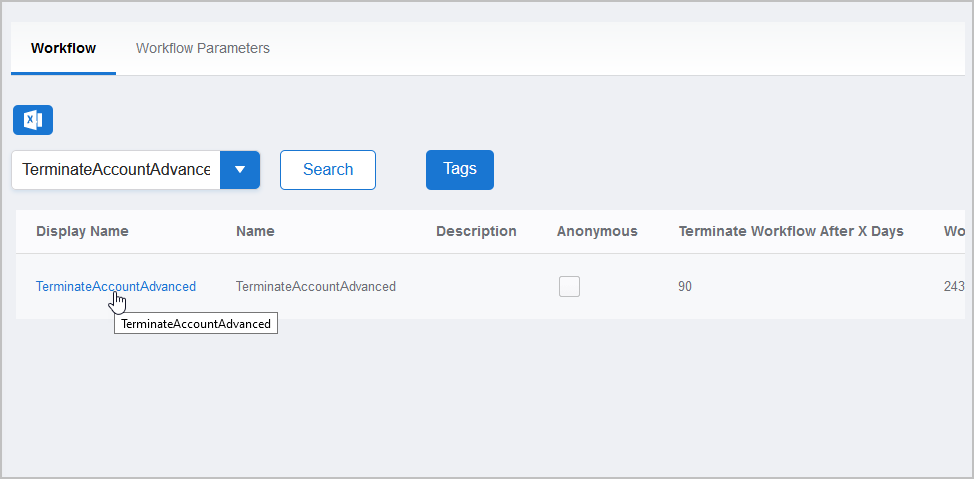 Search for TerminateAccountAdvanced and then click the Display Name link for the workflow.