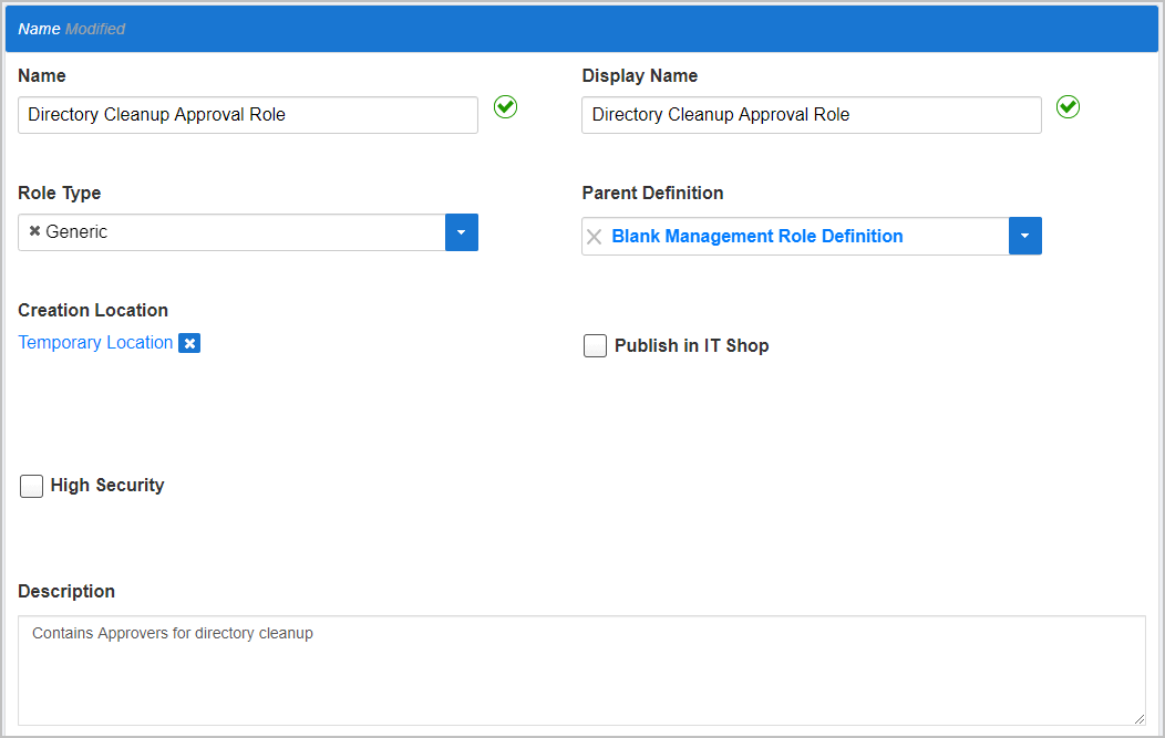 - Publish in IT Shop — Leave enabled to make the Management Role requestable from the IT Shop; otherwise, disable this option