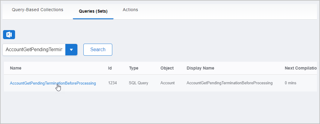 From the Queries (Sets) tab of the Find Sets page, search for AccountGetPendingTerminationBeforeProcessing and then click the Name link for the Set.